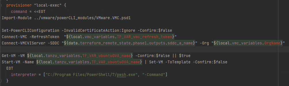 After the TCE OVA file has been uploaded to vSphere, it is converted into a template by a powerCLI scripts that looks like this (variables in red are a consequence of the Terraform plugin I installed on SDE):